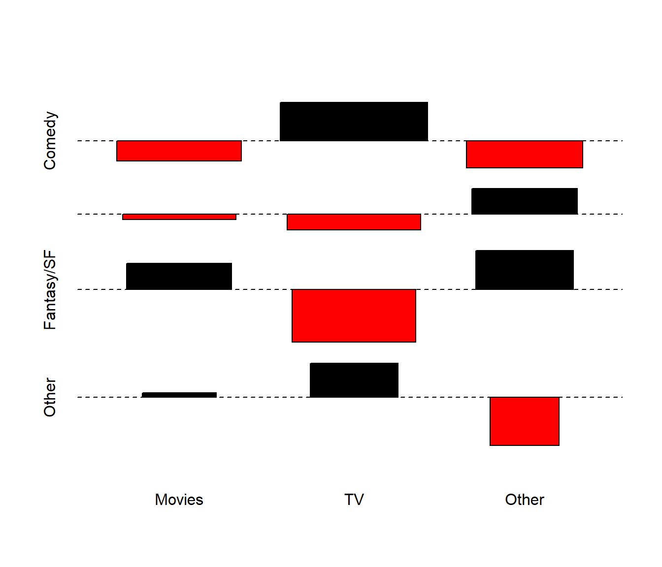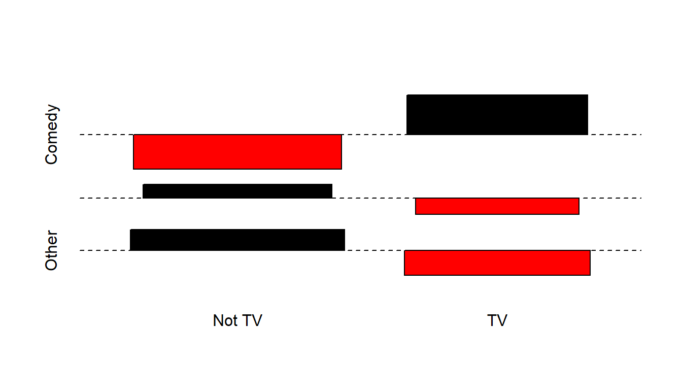 For the project, once all of the cells have at least 5 observations, I recommend the use of the Pearson approach, unless the table is square (# of rows = # of columns), in which case the Fisher test is also a reasonable choice. Generally, the Fisher test is more appropriate when the sample sizes are small. In this case, of course, it doesn’t matter much after collapsing cells and forming this 2x3 table. We’ll close with the association plot for this smaller table, which suggests that the independence model inverts its errors for Comedy as compared to the other two categories.