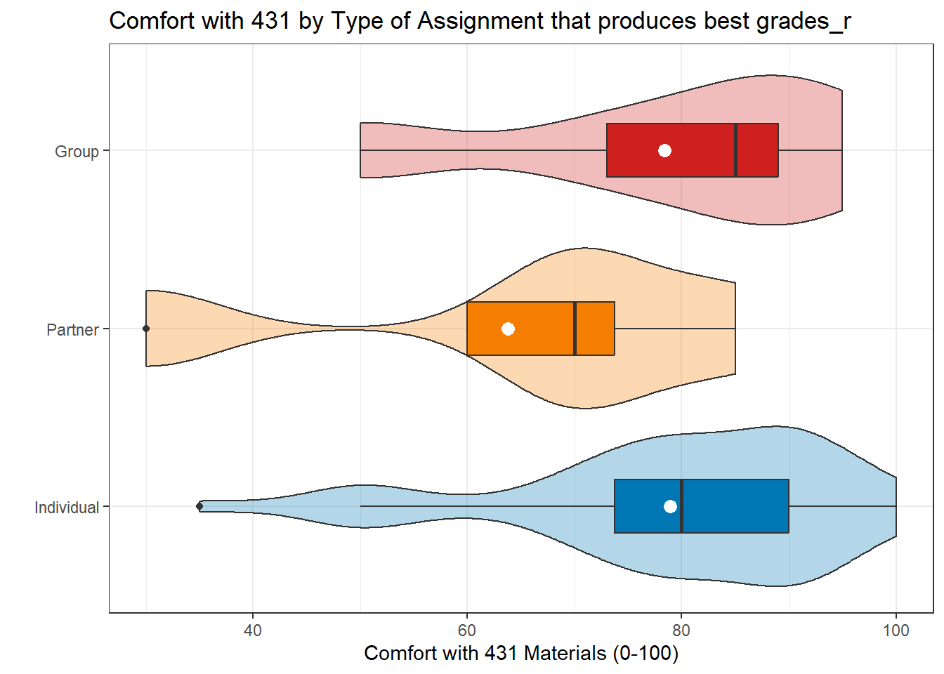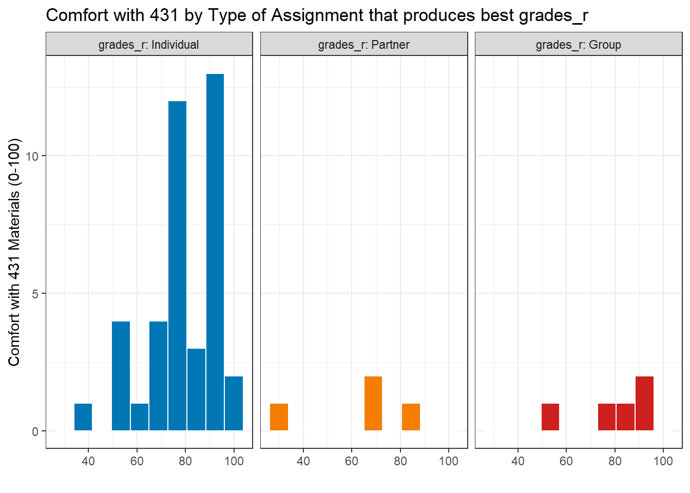 grades: In your graduate and undergraduate educational experience, which of the following types of assignments have you received the HIGHEST grades for?- Available responses were “A. Individual Assignments”, “B. Partner Assignments (you and 1 other student)”, and “C. Group Assignments (you and 2 or more others)”.