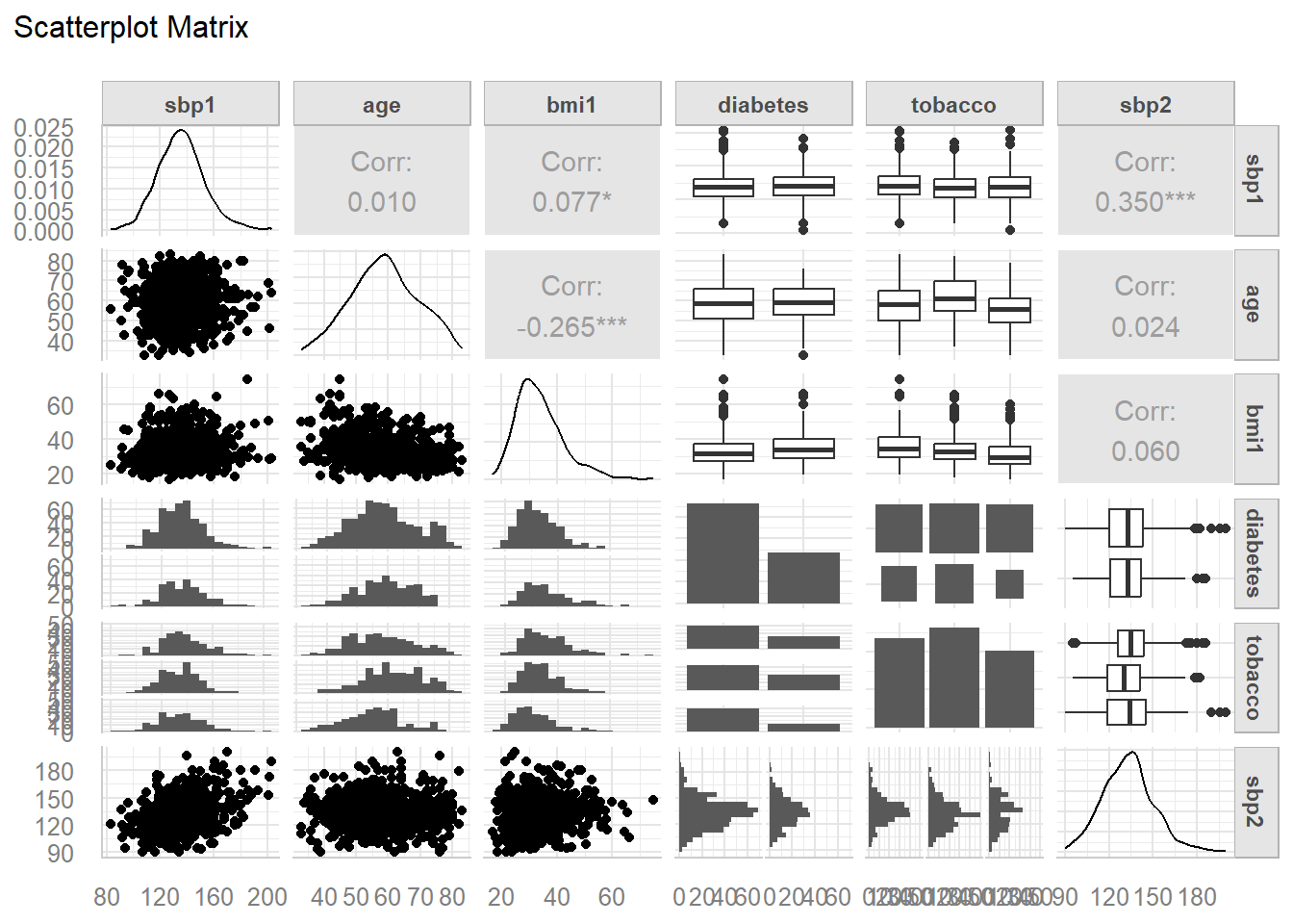 In fitting my models, I actually plan only to use five predictors: sbp1, age, bmi1, diabetes and tobacco to model my outcome: sbp2. Even though I’m not planning to use all of these predictors in my models, I’m going to build a tidy data set including all of them anyway, so I can demonstrate solutions to some problems you might have.