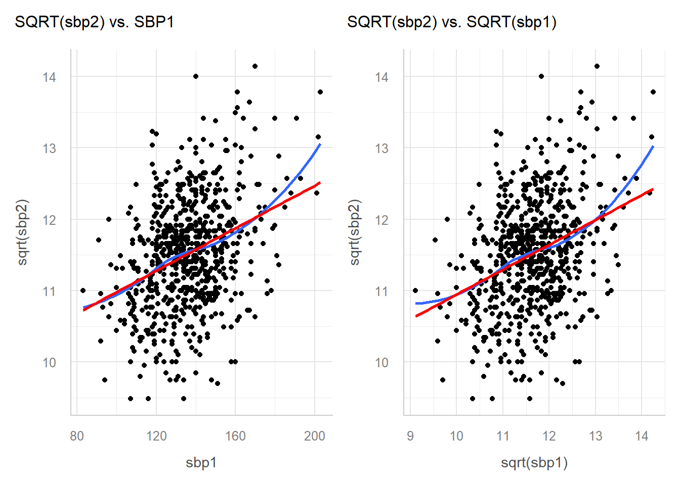 df_stats(~ sbp2 + sbp1, data = hbp_study) response min Q1 median Q3 max mean sd n missing