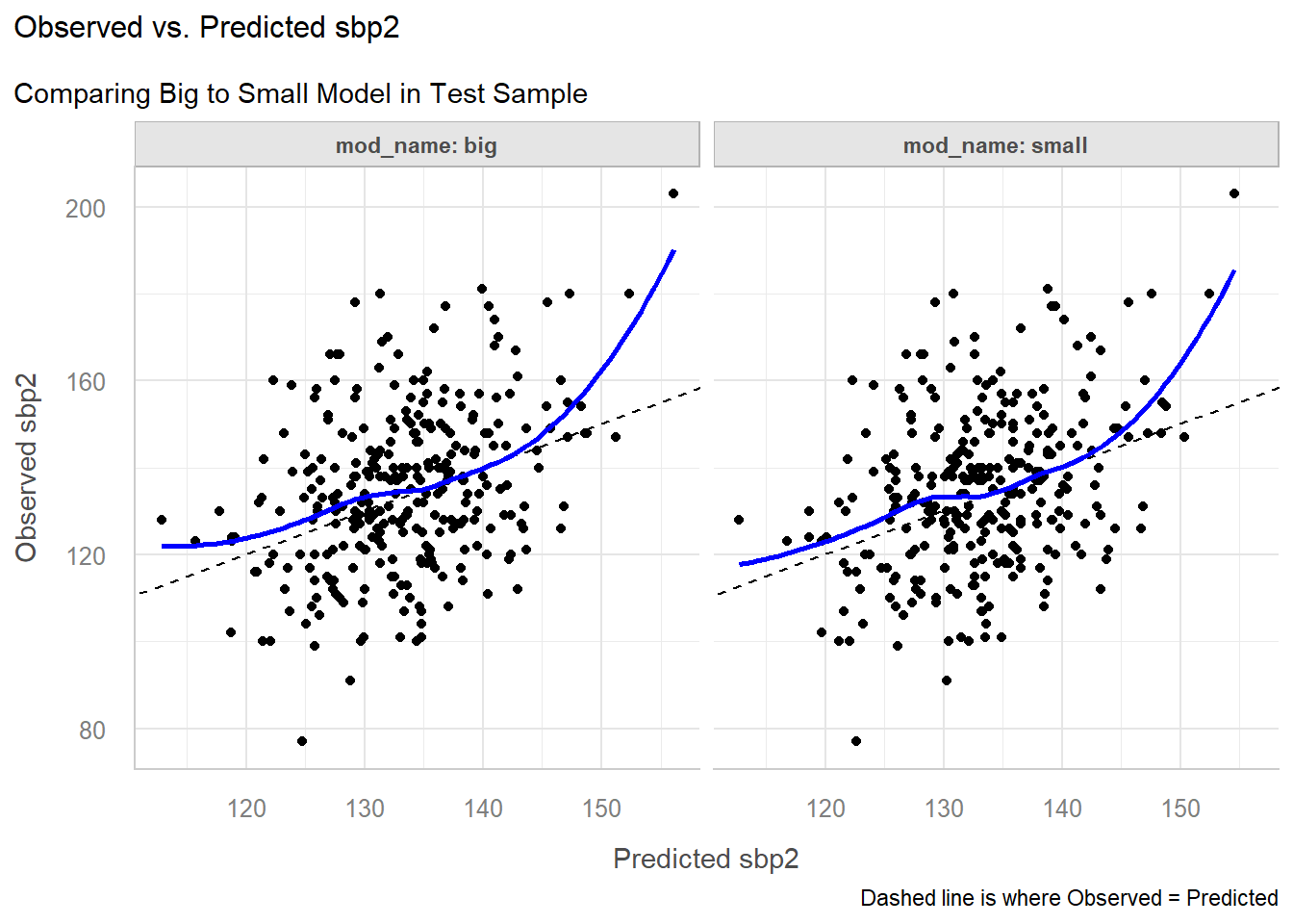 These models suggest an average error in predicting systolic blood pressure (using MAPE) of more than 13 mm Hg. That’s not great on the scale of systolic blood pressure, I think. In addition, our validated \(R^2\) values here are only slightly worse (in either model) than what we saw in our training sample.